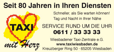 | 65205 | Wiesbadener Taxi - Zentrale WTZ - Taxi und Funktaxi e.G. Kreuzberger Ring 50, 65205 Wiesbaden, www.taxiwiesbaden.de |