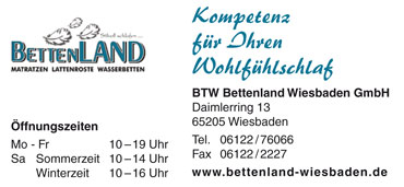 | 65205 | BTW Bettenland Wiesbaden GmbH Daimlerring 13, 65205 Wiesbaden, www.bettenland-wiesbaden.de |